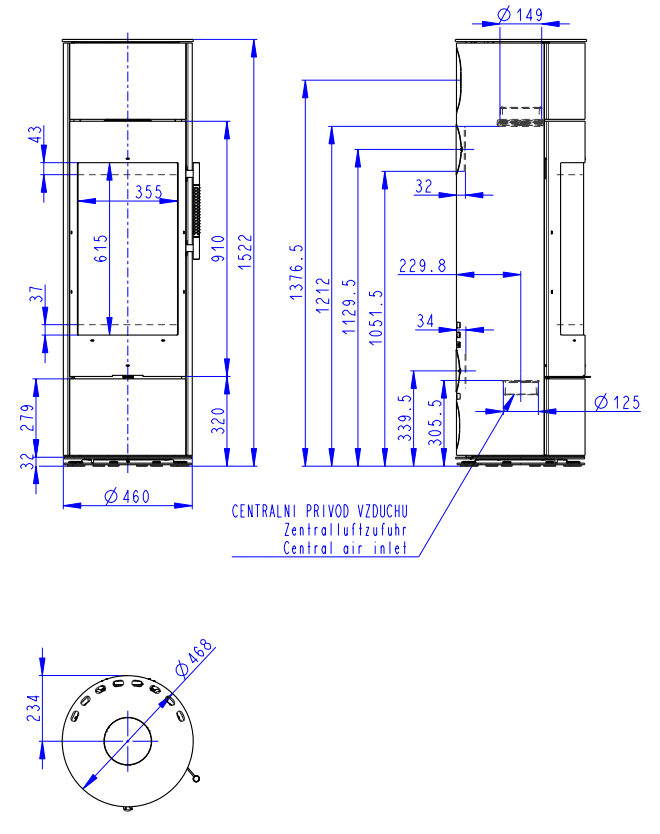 | Prijungimo prie kamino variantai: | iš viršaus / iš galo |