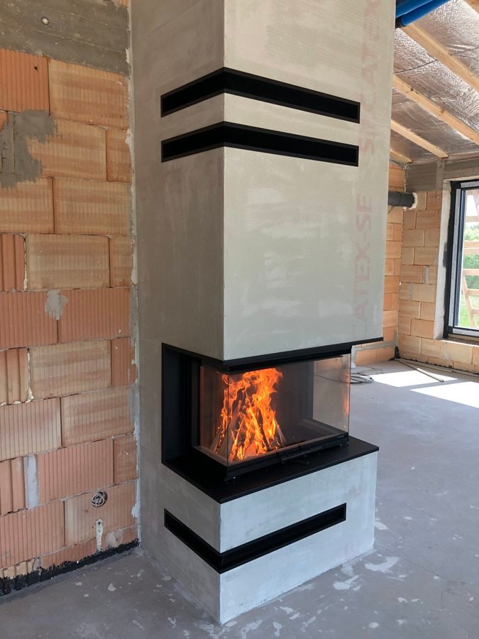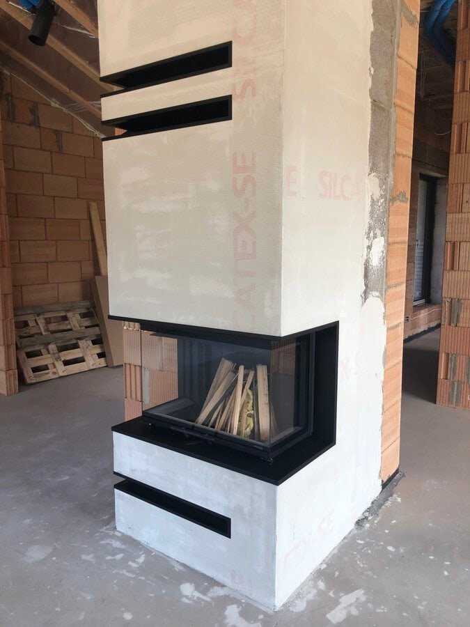 - Montavimo darbai be galutinės apdailos (glaistymo, dažymo). Židinys bus užarmuotas spec. armavimo tinkleliu, kurio glaistymu, dažymu ir kt. apdailos darbais rūpinasi pats klientas. Židinį taip pat galima apklijuoti plytelėmis, akmeniu, naudoti dekoratyvinį tinką ir t.t.